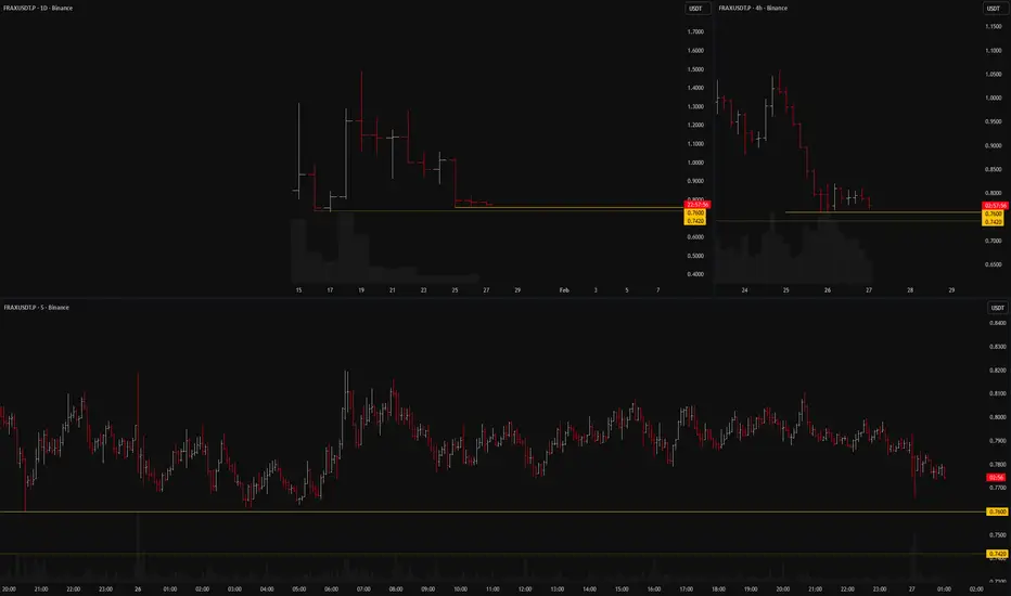 Right now, the price is consolidating above the 0.76 level, positioning itself, in my view, for further downside. What caught my attention is the massive drop on Jan 25, followed by the asset simply "hanging" just above the support with minimal volatility. Normally, volatility decreases gradually. Here, we saw a ~25% crash, and the very next day, volatility dropped by a factor of 3.5. This is abnormal.