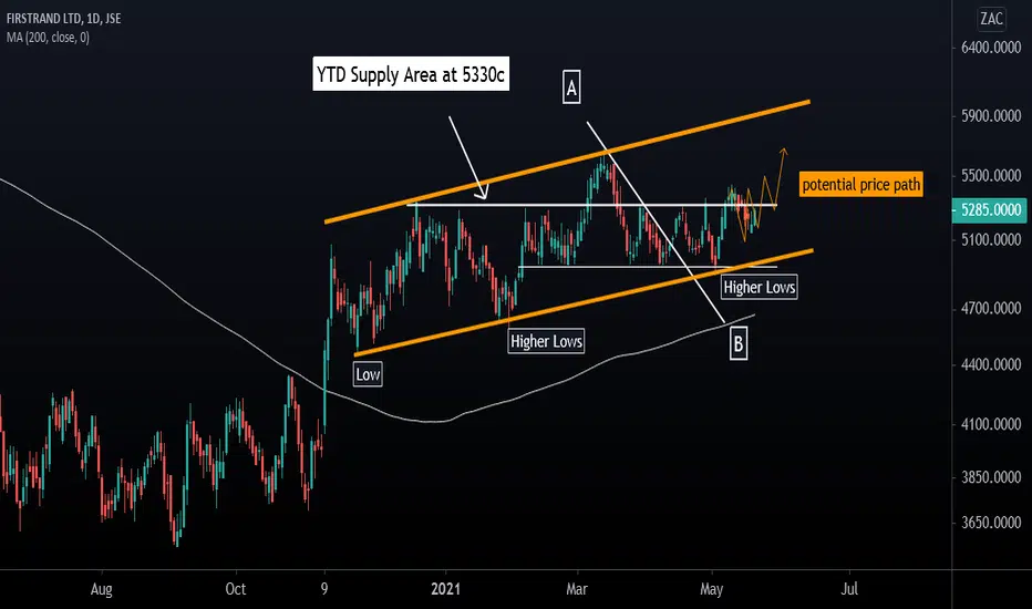 There are times when you've really got to be patient with stocks (not easy). In this case it FSR where I was expecting continued 'chop' as the share attempts to break the year-to-date resistance (see potential price path on chart). So far we've seen a pullback (as expected) with another attempt to turn up in the last two sessions. The current level is in the middle of a broader channel which has been in place since November.