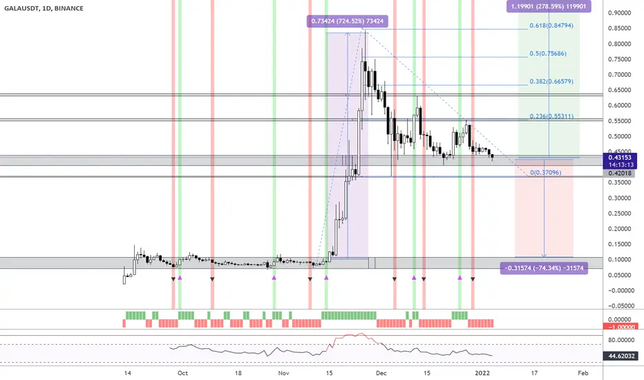 Currently the price seems to be in a range as well. Using Fibs there is potential gains of 280% around 1.62 USDT. Then again if we drop here, it could be as painful as 75%. Currently we are testing support, RSI is in an accumulation zone. Another small drop here before making a bull run, or continue moving sideways in the range wouldn't surprise me as well. GALA is a trade that definitely needs some proper risk management.