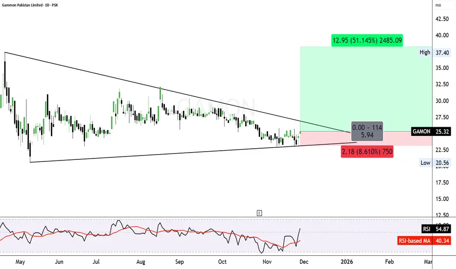 GAMON is breaking out of a long symmetrical triangle on the daily chart, showing fresh bullish momentum as price moves above the upper trendline. With RSI also crossing above its moving average, momentum supports a potential move toward the projected target near 37.40, offering strong upside potential. A protective stop near 23.14 keeps downside risk controlled if the breakout fails.
