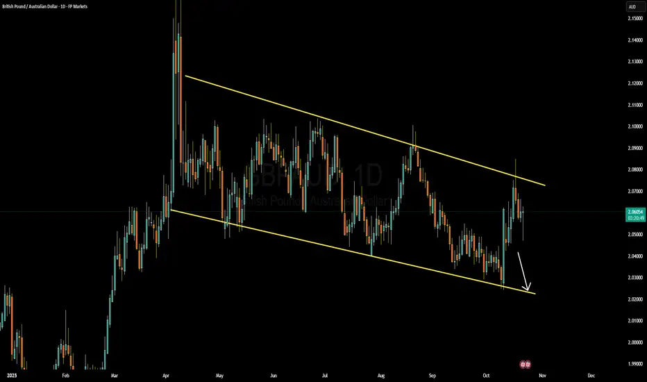 GBPAUD on the daily chart is respecting a well-defined descending channel, showing consistent lower highs and lower lows that confirm a steady bearish market structure. The recent rejection from the upper boundary of the channel around 2.0750 indicates that sellers are regaining control, and momentum could continue driving the pair lower toward the lower channel support near the 2.0200–2.0250 region. This setup highlights a potential short-term bearish continuation as price maintains structure beneath key resistance zones, aligning with broader trend behavior.