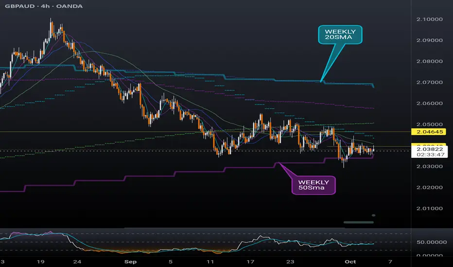 Similar to the previous post regarding GBPJPY, the British pound is finding support at the weekly 50SMA (overlayed on this 4H chart) after a long sell off indicated in the RSI. Cautiously bullish on GBPAUD considering recent strength in the Aussie dollar due to gold hitting new ATHs (and commodities rallying in general). Approach this with expectations of lots of rejections and chop as price action breaks through the daily moving averages wedged between the 50 and 20 weekly SMA (daily and weekly SMAs overlayed on the 4H chart). This could potentially bounce to retest the weekly 20 currently at 2.06 area.