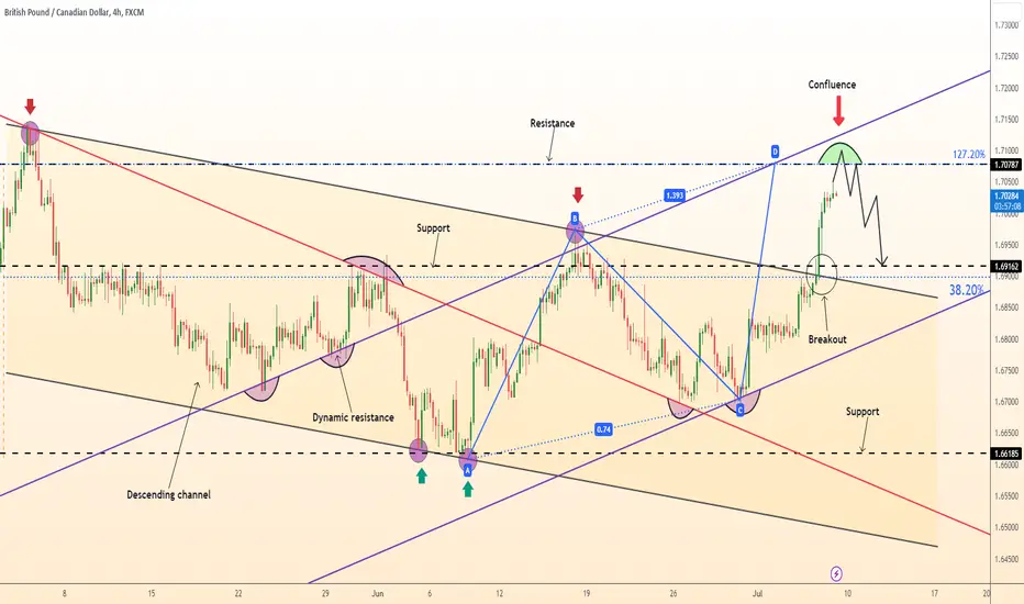 GBPCAD breakout of the ascending channel and it moving to psychological level at 1.71000