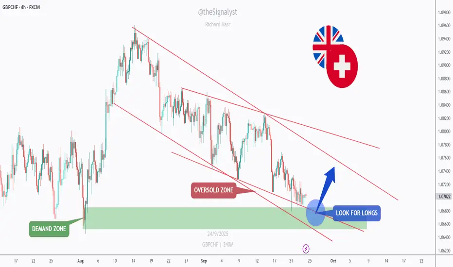 GBPCHF has been drifting lower on the 4H inside a falling channel. Price is now tapping a multi-touch demand zone around 1.066–1.070, right at the channel’s lower bound—classic confluence for a bounce.