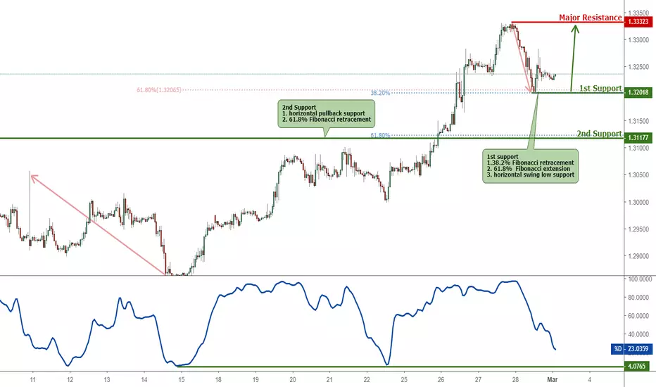 GBPCHF is approaching its support at 1.3202 (61.8% Fibonacci extension, 38.2 % Fibonacci retracement, horizontal swing low support) where price is expected to bounce up to its resistance at 1.3332 (horizontal swing high resistance).