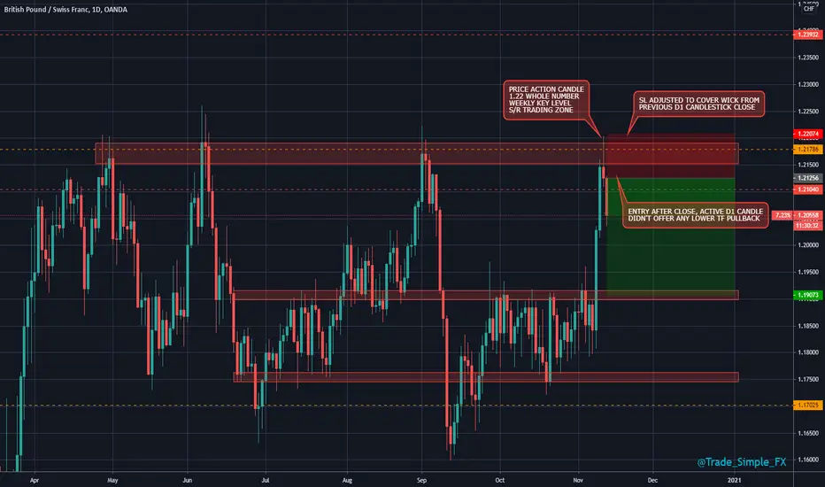 GBPCHF D1 - This is an absolute textbook example of trading between the zones using price action, GBPCHF generally deemed as a slower moving pair (confirmation can be seen). The only issue is, the confirmation candle was very large which skews RR a little bit. Risk markets are still in play which is dangerous too, but confluences all stacked here and the principles and rule sets remain the same.