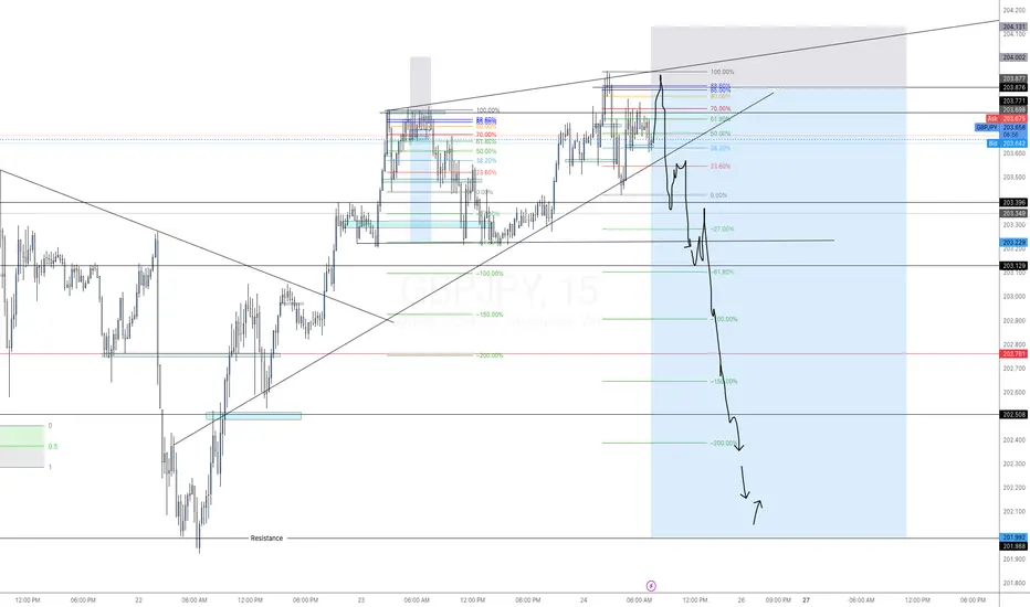 On the 15-minute timeframe, GBP/JPY appears to be completing a rising wedge structure within an extended uptrend. Price is currently rejecting from the 88.6% Fibonacci retracement zone, aligning with upper trendline resistance.