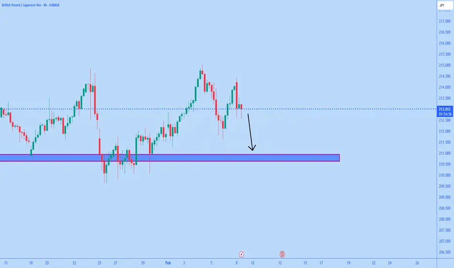 GBPJPY on the H4 timeframe is showing a clear corrective structure after a strong impulsive move, with price rejecting from a recent swing high and rolling over toward a well-defined demand and liquidity zone that previously acted as a strong institutional reaction area. The current market behavior reflects weakening bullish momentum, failed continuation highs, and increasing selling pressure, which supports a controlled pullback toward equilibrium before the next directional decision. Fundamentally, GBP remains exposed to slowing UK economic momentum, cautious Bank of England guidance, and sensitivity to inflation and labor data, while JPY continues to gain underlying strength from Bank of Japan policy normalization, tighter yield differentials, and persistent safe-haven demand during risk-off sentiment. With liquidity resting below current price, volatility expansion visible, and smart money positioning favoring a retracement, the technical structure and macro backdrop align for further downside into demand, where a high-probability reaction or deeper continuation will define the next profitable opportunity.