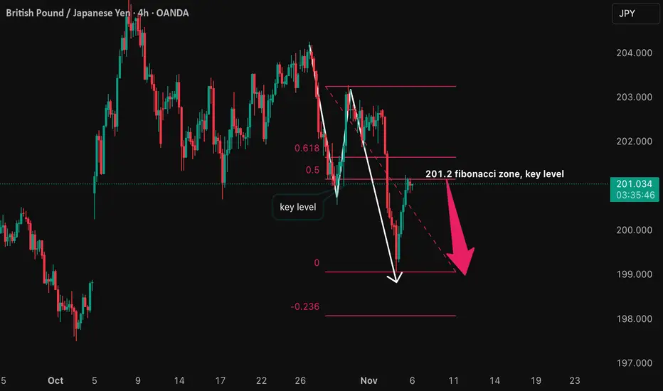 Sell GBP/JPY at 201.1 — Fibo Overlap Setup, in line with the downtrend.