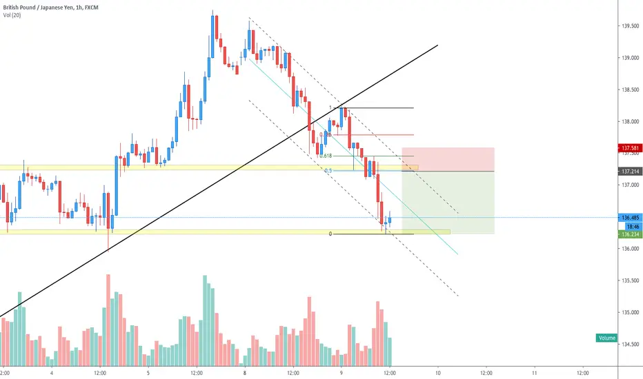 GBPJPY finds itself trending within a descending parallel channel. The pair experienced a slight rejection recently off the previous support. If the rejection gets confirmed and we see a solid bounce upwards, I will be looking to enter shorts on the 0.5 fib retracement and also the LL of the higher descending trendline.