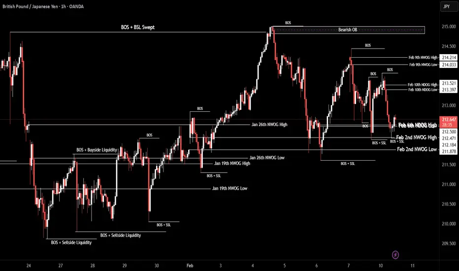 By analyzing the hourly chart of GBPJPY, we can see that after yesterday's drop, it didn't go lower than the 212.13 to sweep the liquidity below and by hitting the Feb 2nd NWOG High, it bounced back up and it is being traded at 212.66.