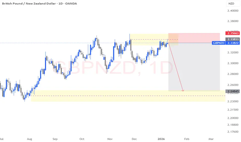 GBP/NZD has been trading inside a broad daily range, repeatedly respecting both premium and discount extremes. Price is currently trading at the upper boundary of the range, inside a clear premium zone, where previous buying momentum has struggled to follow through.