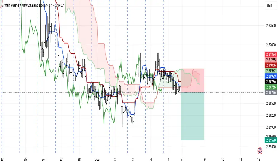 GBPNZD is maintaining a bearish structure as price continues to trade below the Ichimoku Cloud. The Conversion Line is positioned beneath the Base Line, confirming downside momentum and signaling sustained bearish pressure. With price remaining under cloud resistance and the Chikou Span not showing signs of reversal, the short bias stays intact. This setup aims for a 2:1 risk-to-reward ratio, targeting continuation of the current downward move as long as bearish alignment holds.