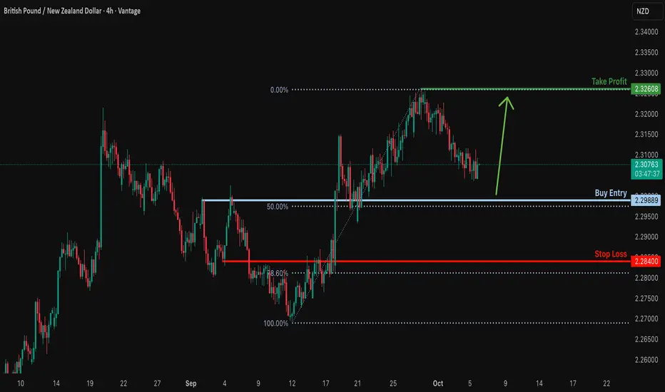 GBP/NZD is falling towards the support level, which is an overlap support that aligns with the 50% Fibonacci retracement and could bounce from this level to our take profit.