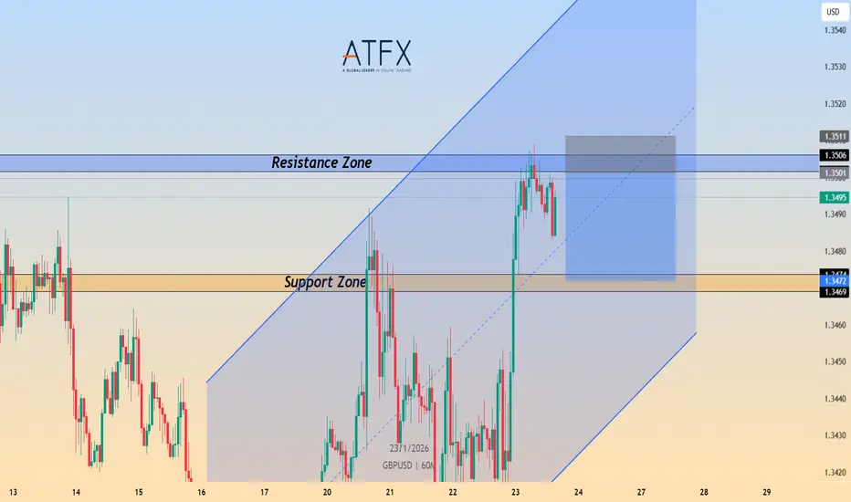 Price action suggests a corrective move lower is unfolding. As long as GBP/USD remains capped below the resistance zone, the near-term structure favors a continuation toward the 1.3469–1.3472 support zone, which coincides with the lower boundary of the channel and a key demand area.