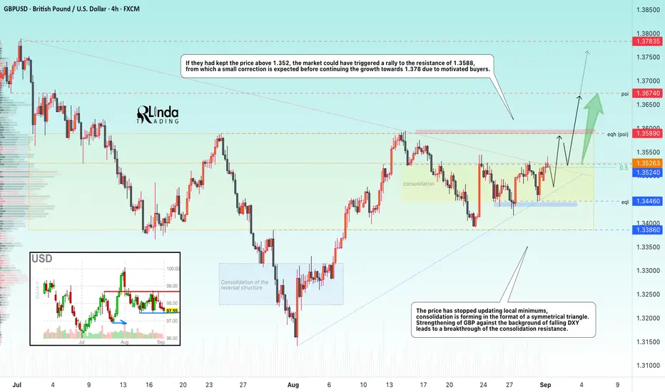 Against the backdrop of stagnation and weakening of the dollar index, the GBPUSD price has stopped updating local lows, and consolidation in the form of a symmetrical triangle is forming. The strengthening of the GBP led to a breakout of the consolidation resistance, and if the bulls can stay above 1.352, then the market may trigger a rally to the resistance at 1.3588, from which a small correction is expected before continuing to grow to 1.378 thanks to motivated buyers.