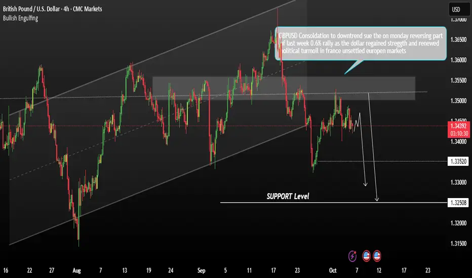 GBP/USD Structure British pound weakened to 1.3440 on Monday, reversing part of last week’s 0.6% gain, as renewed U.S. dollar strength and political uncertainty in France weighed on European markets the Bank of England has kept interest rates unchanged, and markets do not expect rate cuts until 2026, as inflation remains persistently high. This hawkish outlook continues to limit upside potential for GBP.