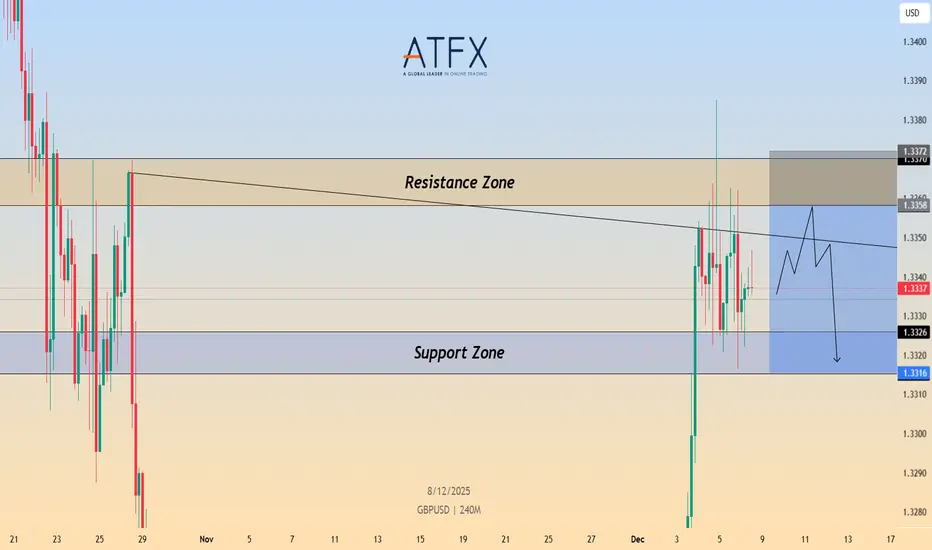 GBPUSD GBP/USD continues to consolidate around the 1.3330 level after last week’s strong rebound, with price holding above the 1.3316–1.3326 support zone while repeatedly failing to break the 1.3358–1.3370 resistance zone. A descending trendline from prior highs continues to cap upside momentum, forming a compression pattern as the pair approaches the Federal Reserve decision.