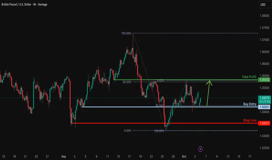 GBP/USD has bounced off the support level, which is a pullback support that aligns with the 50% Fibonacci retracement and could rise from this level to take profit.