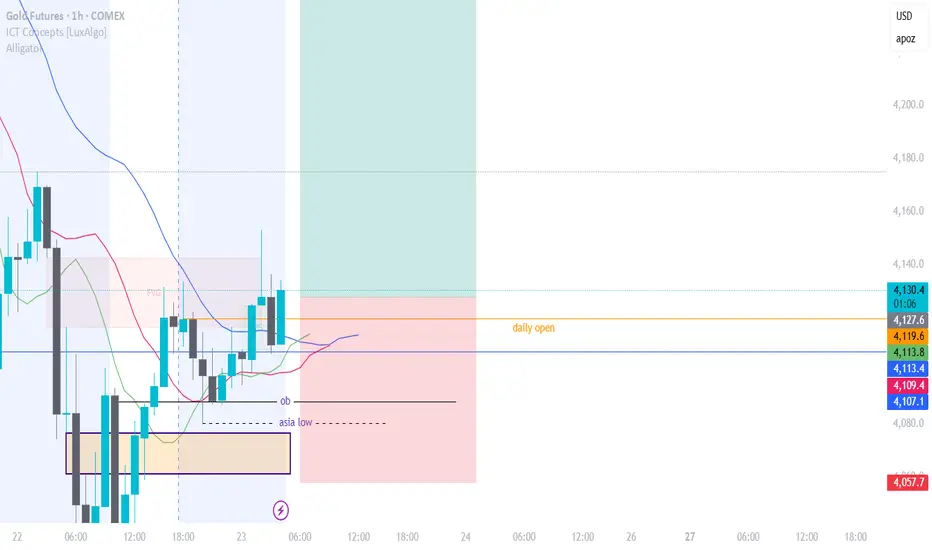 - **Entry Zone:** 4,110 – 4,128 (support + Alligator confluence)