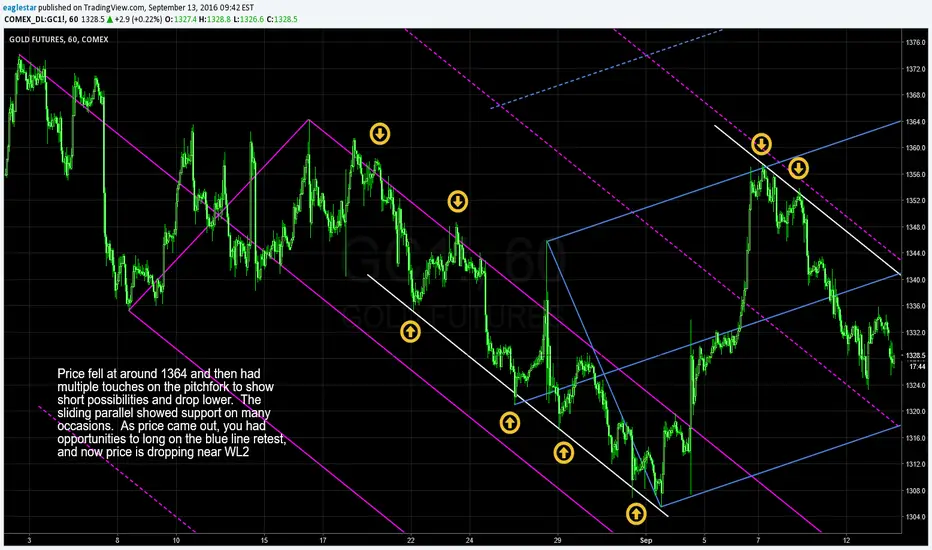 Price fell at around 1364 and then had multiple touches on the pitchfork to show short possibilities and drop lower. The sliding parallel showed support on many occasions. As price came out, you had opportunities to long on the blue line retest, and now price is dropping near WL2