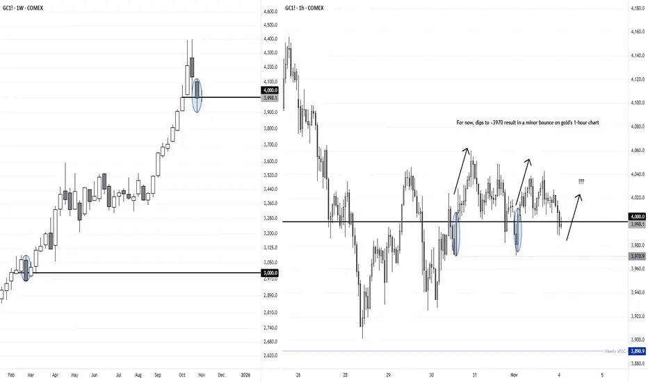 My video from Friday provides a bullish bias on the daily timeframe over the near term which still stands. But for those on intraday timeframes, notice that bullish engulfing candles have appeared on the 1-hour chart on the prior two occasions that gold tried (but failed) to break beneath 4000. It’s as if gold bears are trying to force the golden beach ball below its 4000 waterline.