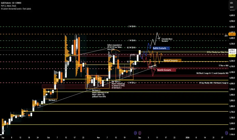 • Continued seller control may extend the move toward 4070/80, aligned with the 2-week composite VAH and upper boundary of Bid Block 2.