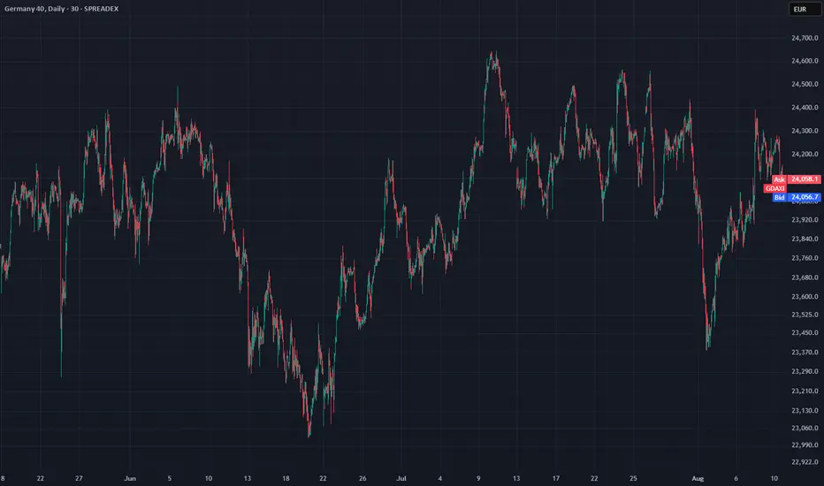 Germany 40 is in a range-bound environment, currently trading at 24,061, exactly at its VWAP of 24,061. RSI at 50 reflects balanced momentum. Support lies at 23,540 and resistance is seen at 24,657.