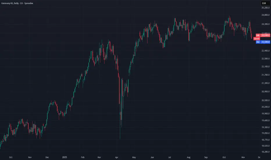 Germany 40 is neutral and ranging, with price at 23,843 slightly below the VWAP of 24,026. RSI at 44.2 reflects limited bearish conviction. Support is at 23,610, resistance at 24,410.