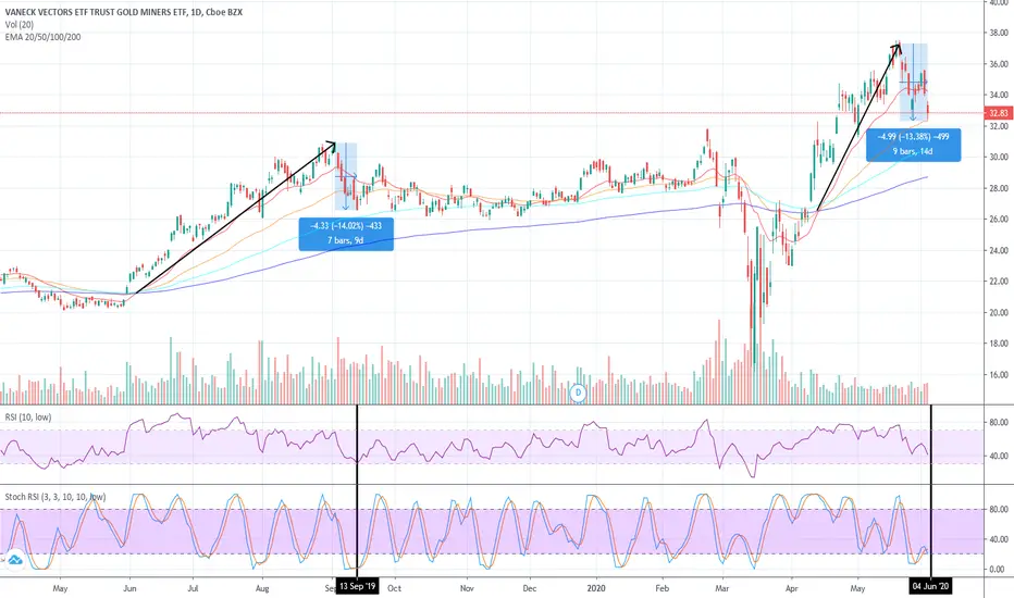 If move resembles earlier setup in bull trend, expect near term bottom around $31-32.