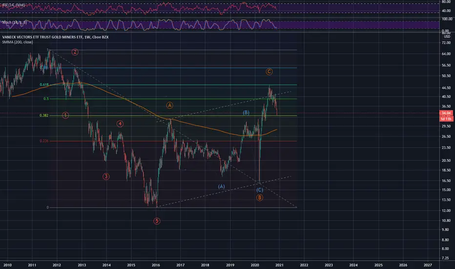 On the chart we see nice 5 wave move down from 2011 till 2016 followed by 61% running flat correction topped in Aug this year. This probably can give us some clue on whether the following Gold price fall is a short term correction or a beginning of a long term down trend. I would bet the latter.