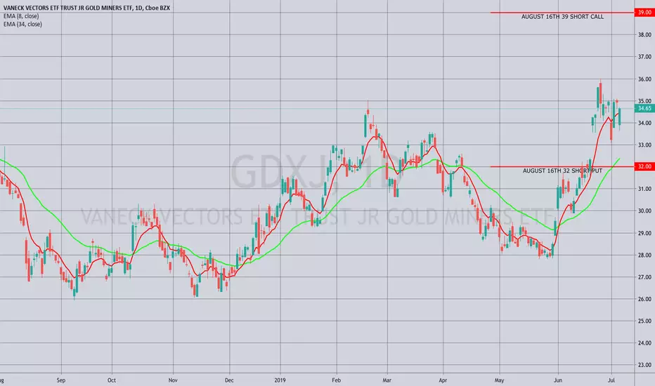 Pictured here, remarkably, is the exact same setup strike-wise that I posted last week in GDXJ in the August cycle -- the nearest the 20 delta 32/39 short strangle, paying 1.06 at the mid price with break evens at 30.94/40.06 and delta/theta metrics of 2.82/2.92.