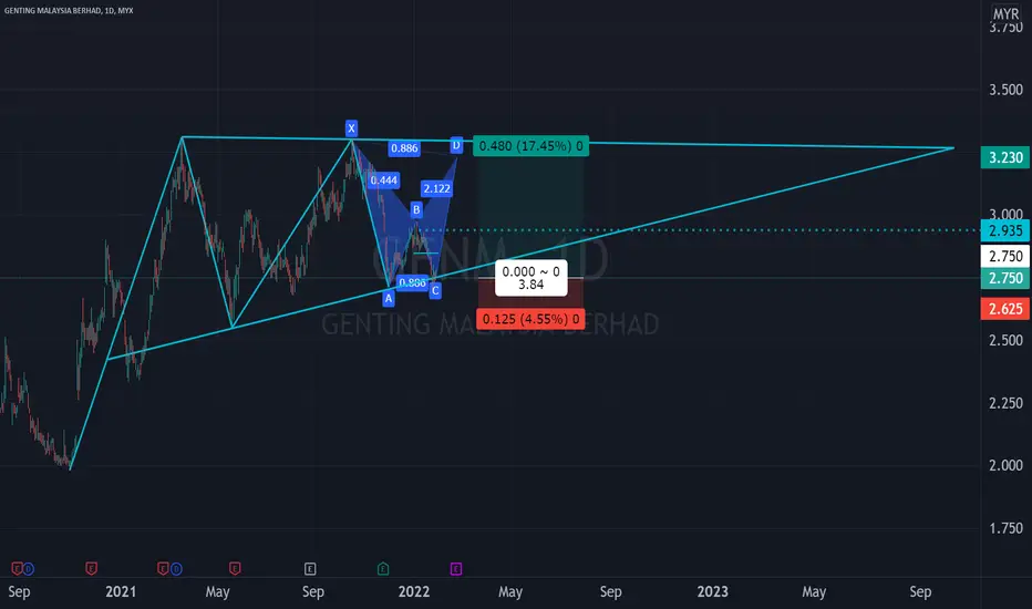 GENM spotted with bearish bat harmonic pattern rebounding at fib0886 (Point C) where a potential trade can be taken up to fibo886 extension or Point D. The harmonic pattern happens to be inside a bullish pennant. Proposed trade as per chart where the CL is below a yearly pivot (not shown).