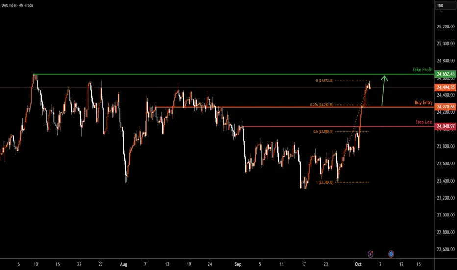 GER30 is falling towards the buy entry at 24,270.66, which is a pullback support that lines up with the 23.6% Fibonacci retracement and could bounce from this levle to the take profit.
