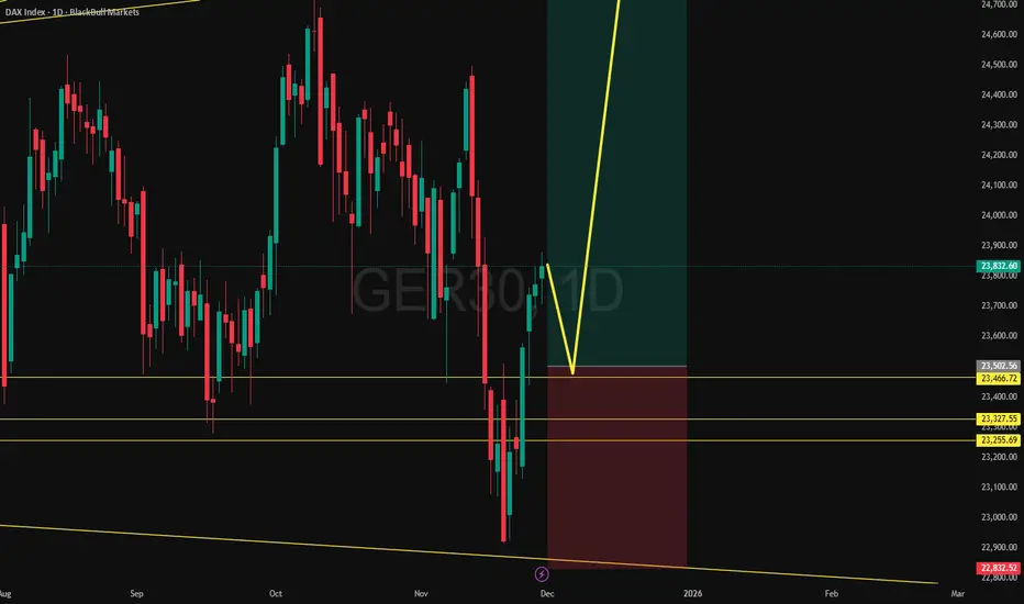 DAX is trading inside a broadening/expanding wedge within a larger uptrend. Price has recently swept the lower boundary and faked below a short-term trendline, showing signs of a downside trap.