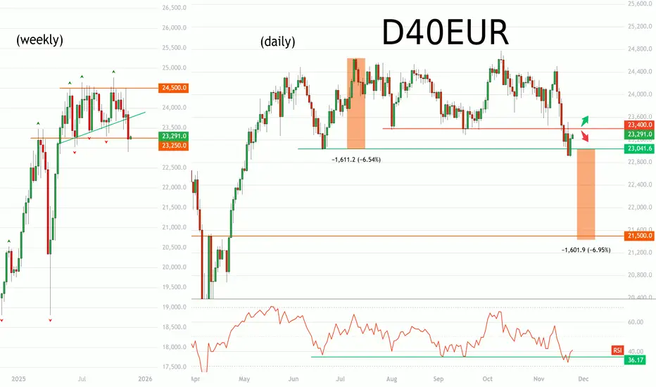 The DAX is sitting right on the support level of its long term range. The index could rally back into its range, offering reversal setups to go long, or it could continue to breakdown. Should it be the latter, projecting the height of the range lower would target 21500 - a demand area preceding the April rally.
