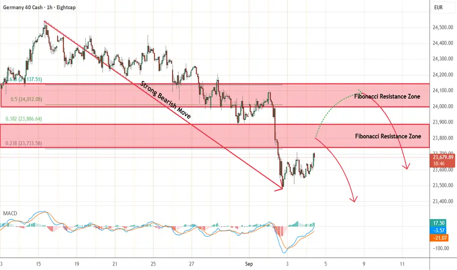 Expecting bearish continuation until the two Fibonacci resistance zones hold.