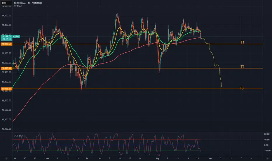 The DAX is currently trading around 24,150. On the 4-hour chart, price has dropped below the 10 EMA (red line) and failed to reclaim it, which is a bearish signal. The short-term EMAs (yellow and green) are flattening and starting to turn down, showing weakening bullish momentum.