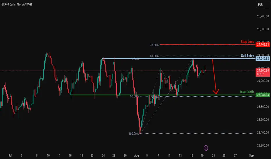 GER40 has rejected off the resistance level, which is a multi-swing high resistance that is slightly below the 61.8% Fibonacci projection, and could drop from this level to our take-profit.