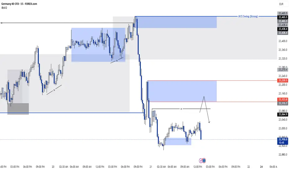 In GER40 analysis we can see that our daily , h4 and m15 timeframes are bearish.. now we're just analysing m15 time frame and in m15 time frame we can see m15 structure is clearly bearish so now it will do pullback .as i marked 2 blue zones which are m15 demand zone for sell... by my perspective from the downside first blue zone(23220.5 - 23123.0),from this zone the market will give us sell entry and till we'll patiently wait ....let's see... :)