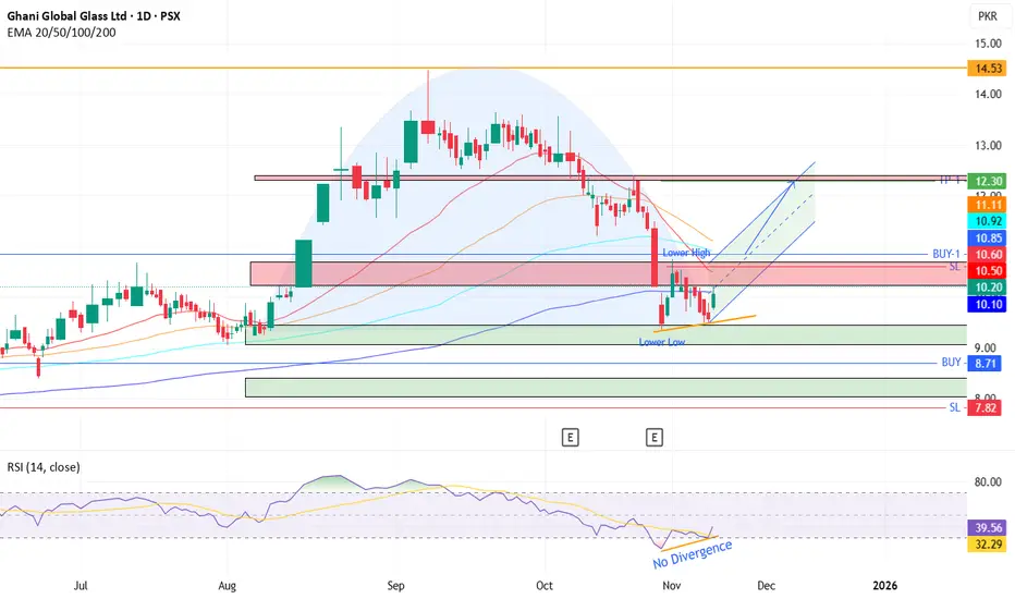 Technically, very correct entry is at BUY-1, after crossing the previous Lower High with TP around 12.30 and SL 10.60.