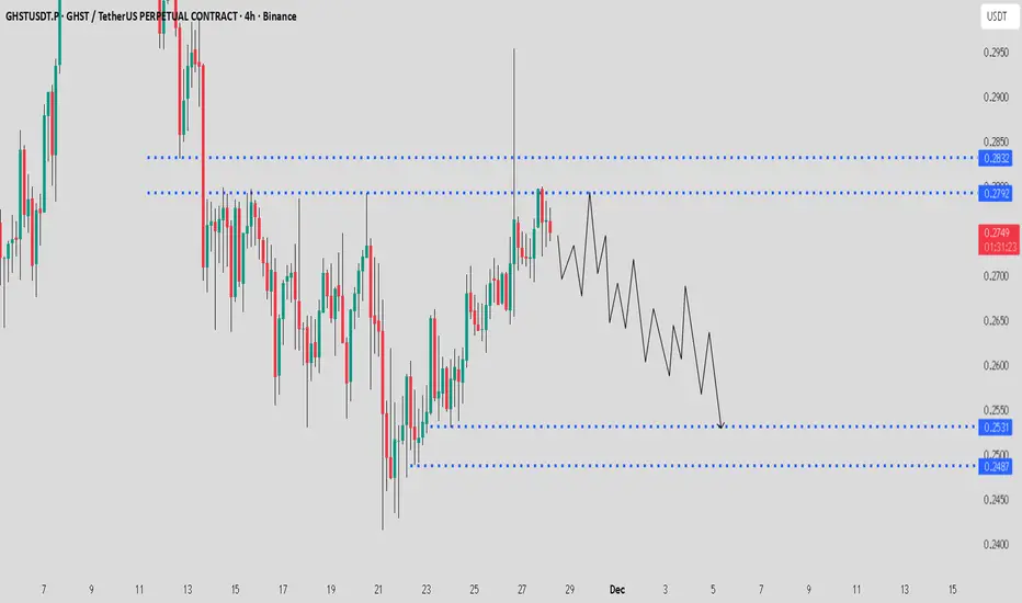 GHST / USDT is showing weakness after rejecting from the FVG resistance. Price is likely to move towards the $0.2530 – $0.2487 zone before any potential reaction. This area remains the safer zone for taking profit on shorts. More downside is still possible, so manage risk and keep stops above the upper marked level.