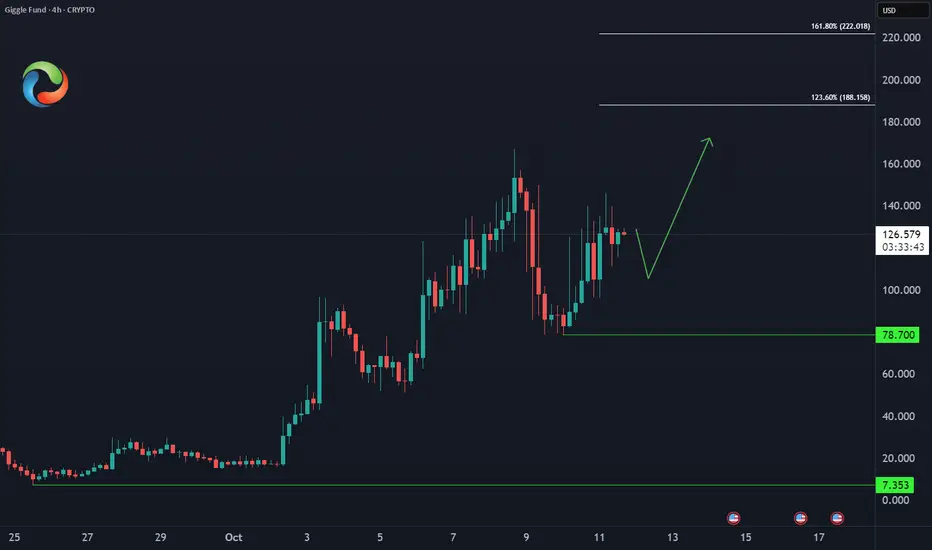 GIGGLEUSDT.P holds above yesterday’s low of $78.70, the bullish outlook remains intact. Price is expected to continue pushing higher toward the target zone of $188–$222.