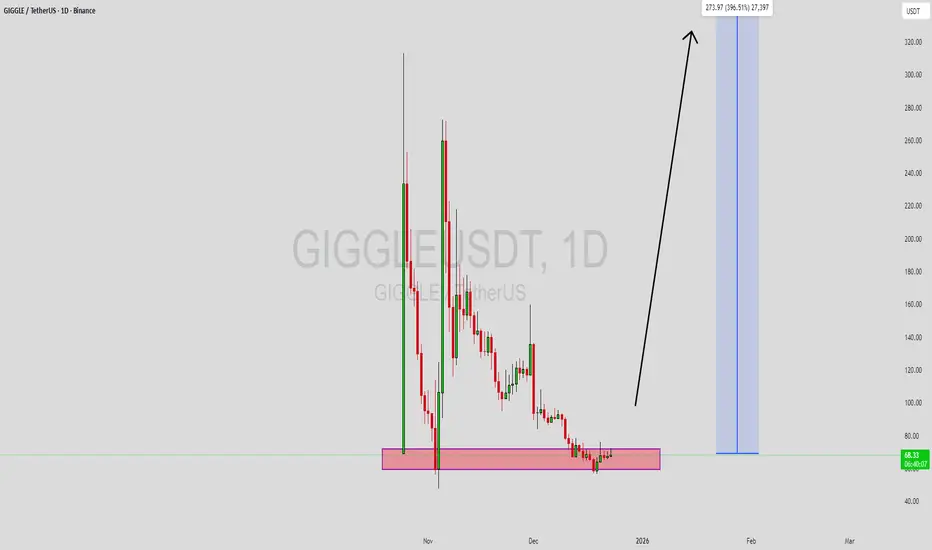 GIGGLEUSDT is forming a clear bullish momentum pattern, a classic bullish reversal signal that often indicates an upcoming breakout. The price has been consolidating within a narrowing range, suggesting that selling pressure is weakening while buyers are beginning to regain control. With consistent volume confirming accumulation at lower levels, the setup hints at a potential bullish breakout soon. The projected move could lead to an impressive gain of around 290% to 300% once the price breaks above the wedge resistance.