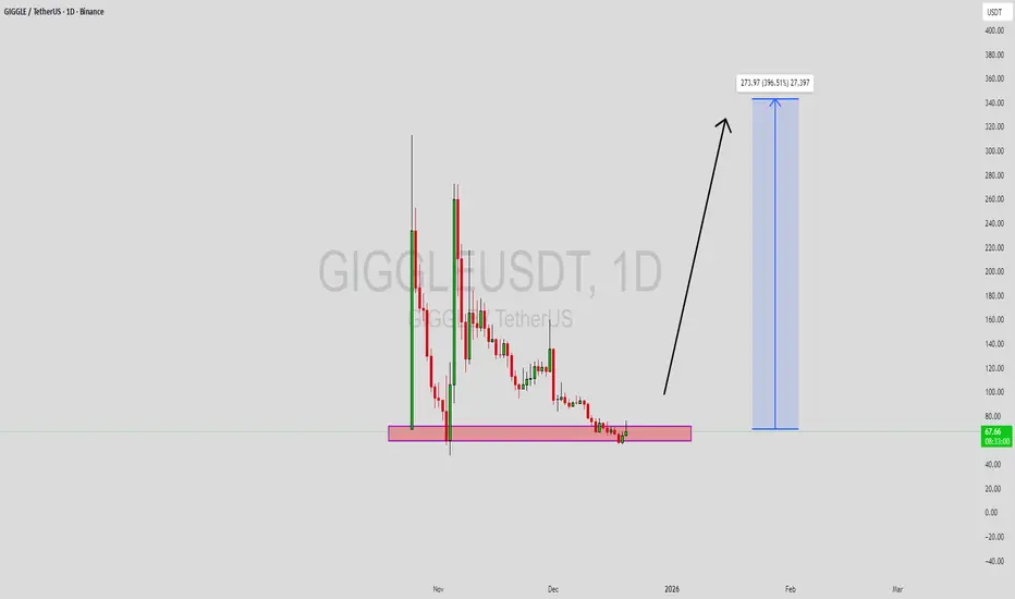 GIGGLEUSDT is forming a clear bullish momentum pattern, a classic bullish reversal signal that often indicates an upcoming breakout. The price has been consolidating within a narrowing range, suggesting that selling pressure is weakening while buyers are beginning to regain control. With consistent volume confirming accumulation at lower levels, the setup hints at a potential bullish breakout soon. The projected move could lead to an impressive gain of around 290% to 300% once the price breaks above the wedge resistance.