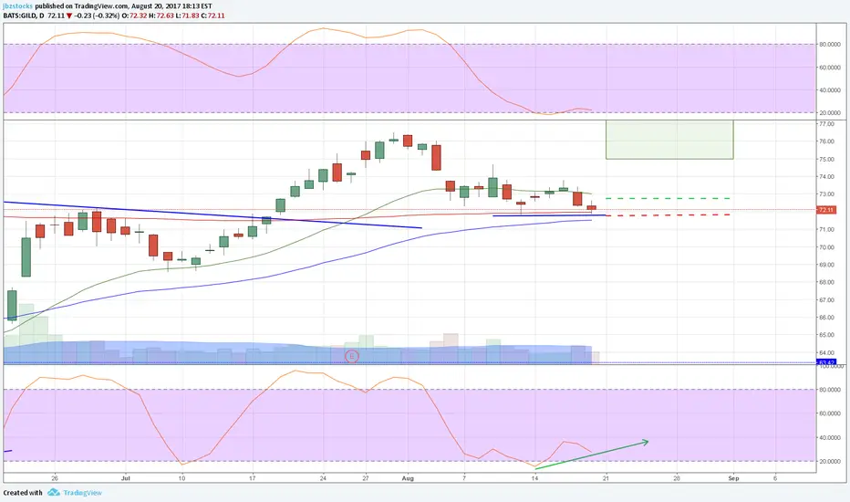 Double bottom with stochastic divergence. Looking for a move up in price before entry at 72.75. Stop is set to 71.75. Looking for a target of 75.00 - 78.00