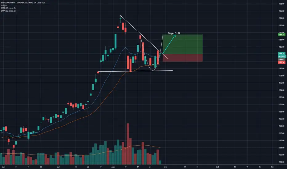 GLD gapped up this morning back over its moving averages, showing bullishness from yesterdays decline. I expect the rally to continue and break the flag pattern and complete its rounding formation to $189 level.