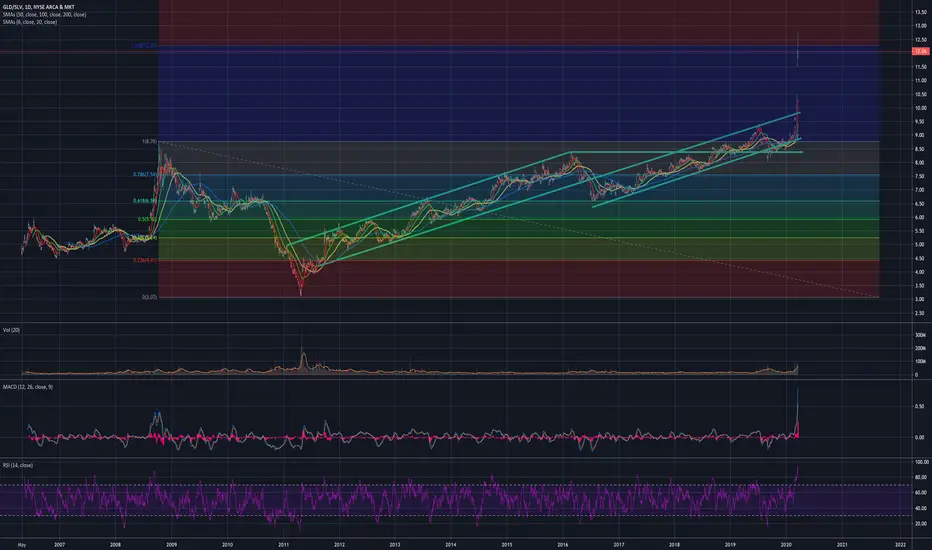 This just looks like a monster blow off top similar to 2008-2009. It hit 127.5 which far exceeds any measure of this ratio by 20-25%. MACD and RSI starting to turn. I see silver rising and gold just marking time between $1450-$1520 before it resumes the next leg up.