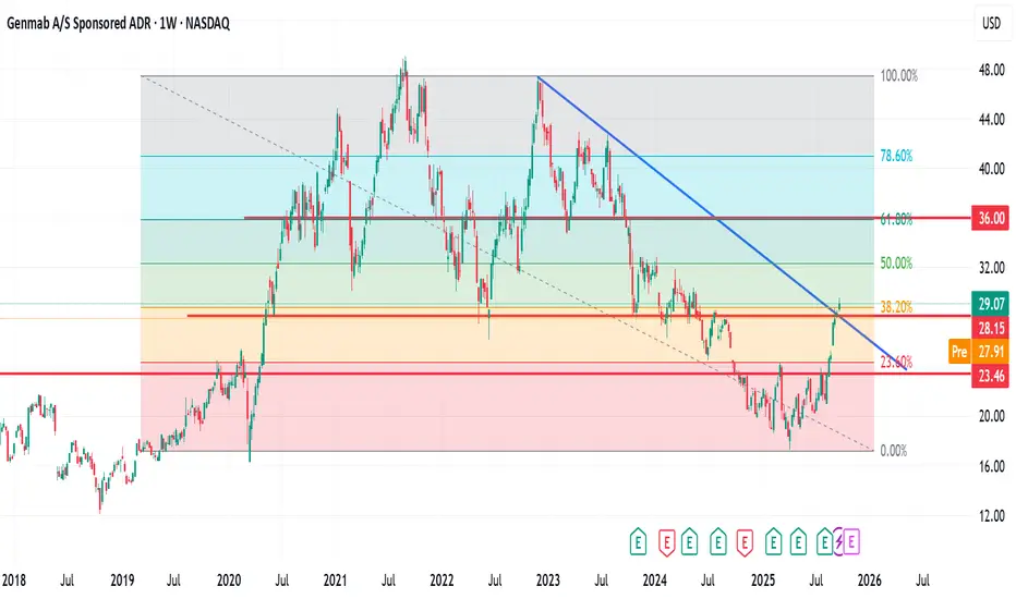 GMAB has shown strong recovery momentum since its April 7th, 2025, low. The price is currently testing a significant confluence area formed by a descending trendline and the Fib 38.2% support level.