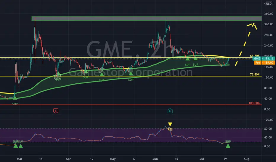 GameStop - GME - Are you ready to get in the Game? GME found support at the lower moving average. The last time GME touched the lower moving average there was a big move in price. What will happen next? Move up or move down?